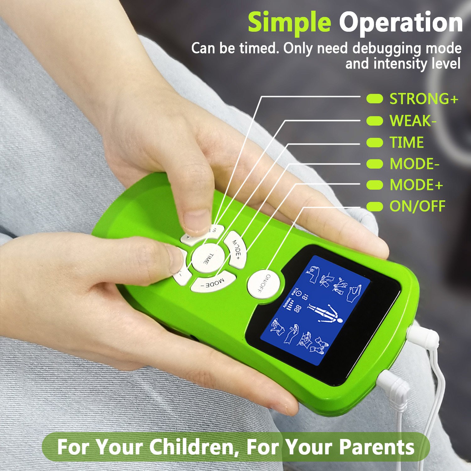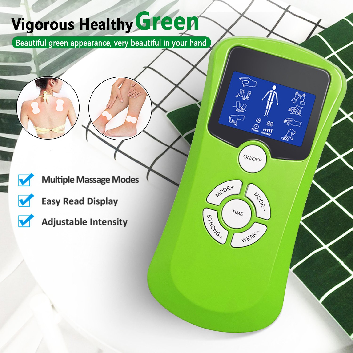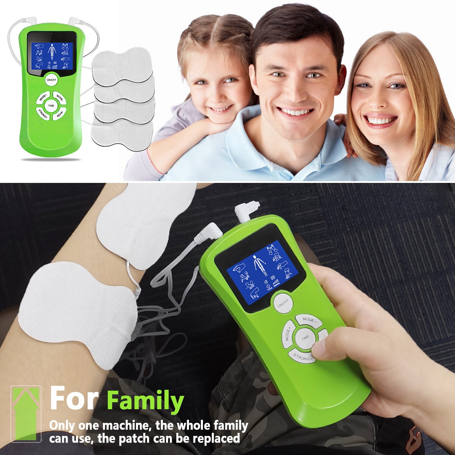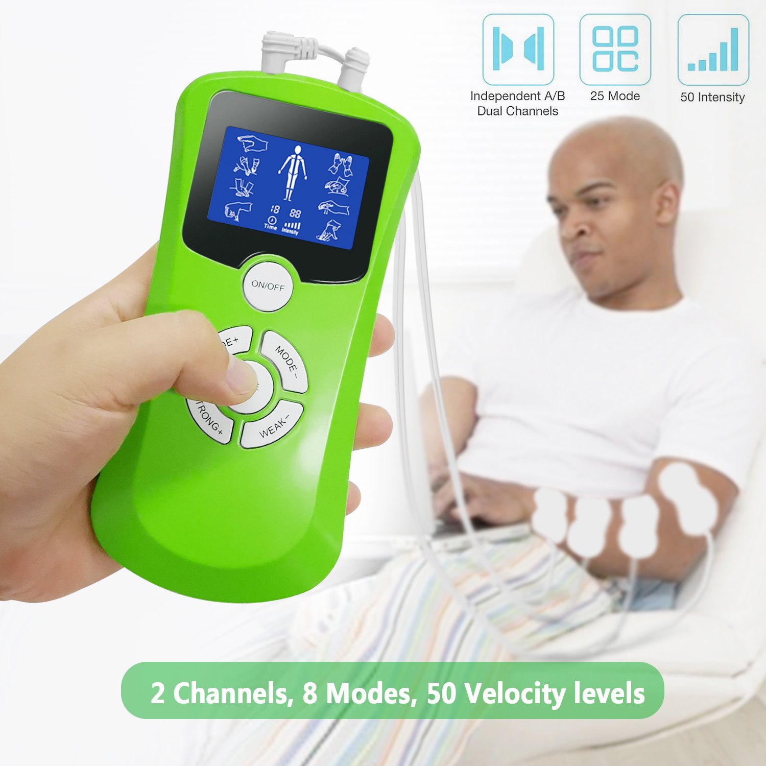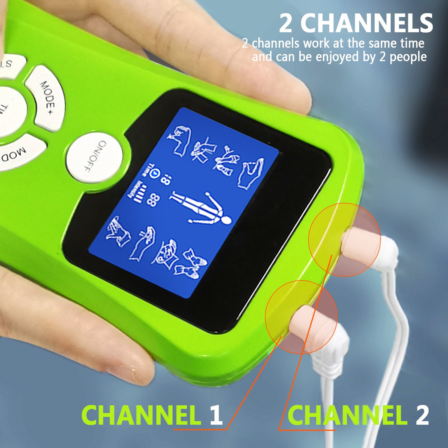 INDEPENDENT MODE CONTROL - Dual Channels allow you to operate it like two separate TENS machines at once. You can massage 2 parts of your body area(not include the face; head; area colse to heart)with 2 different intensities at same mode. Making it more convenient to use and relax your body whenever you need.