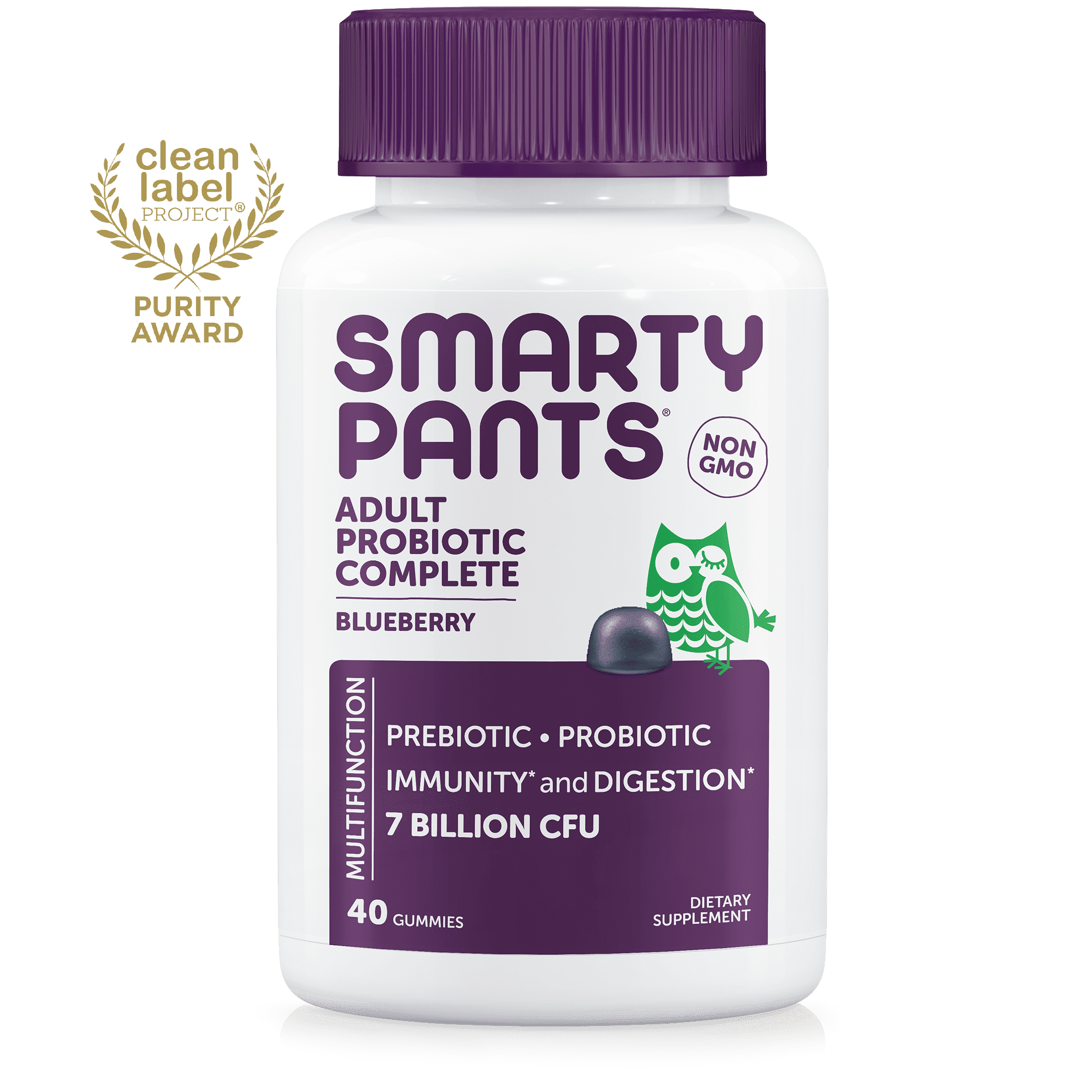SmartyPants Adult Probiotic Complete; Blueberry; 40 ct SmartyPants Probiotic Complete are more than just probiotics — they’re multi-strain probiotics and prebiotic immune support; all in one.* We specifically chose B. subtilis and B. coagulans because they are two of the most researched probiotics out there. Each serving delivers 7 billion probiotic CFU in spore form – the form of probiotics that can survive time on the shelf and the harsh stomach acid. This natural microencapsulation ensures that 99% of our probiotics will reach the intestine alive; where they can flourish; multiply; and help you thrive.* Best of all; no refrigeration required! Our probiotics are reinforced by beta 1; 3/1; 6 glucan. Beta-glucan is a prebiotic that does double duty; it strengthens your immune system and acts as an ideal food to feed probiotic bacteria. In other words; prebiotics help probiotics help you.* • Flavor: Blueberry • Serving Size: 2 chewable vitamins • Count: 40 probiotic gummies • 7 billion CFU per serving in spore form – 99% will reach your digestive track alive • DE111® and IS2: two probiotic strains for clinically-proven digestive support and balance* • Prebiotic Wellmune® supports the growth of probiotics and a healthy immune system* • Help to replace flora probiotics in digestive tract • Organic & Fair-Trade cane sugar and organic tapioca syrup • AVA-Certified vegan ingredients • Adult Probiotics for women and men • Compare to: Centrum; One a Day Multivitamin; Vitafusion Multivites What you won't find in our vitamins: · No Synthetic Colors · No Artificial Sweeteners · No Artificial Flavors · No Artificial Preservatives · No High Fructose Corn Syrup · No Gluten · No Tree Nut Allergens · No Fish Allergens · No Peanuts · No Dairy About SmartyPants Founded in 2010; SmartyPants is all about simplifying health without sacrificing quality or deliciousness. We believe that you shouldn't have to be wealthy to afford the best ingredients from a source you trust. Created by a group of concerned parents and leaders in health and wellness who knew everyone deserved premium nutrients at a fair price and in a tasty format they would stick with; SmartyPants never uses any synthetic colors or artificial flavors; sweeteners; or preservatives. All SmartyPants products are non-GMO and third-party lab tested. For every bottle of SmartyPants sold; the company makes a 1-for-1 matching nutrient grant to a child in need through its partnership with Vitamin Angels. Try our whole line of Smarty Pants chewable multivitamins: Masters Complete Men/Women 50+ Men's/Women's Complete Adult Complete and Fiber Adult Probiotic Complete Prenatal Complete Teen Girl/Guy Complete Kids Probiotic Complete Kids Complete Kids Complete and Fiber Follow us: Website: SmartyPantsVitamins.com Facebook: SmartyPants Vitamins Twitter: SmartyHealth Instagram: SmartyHealth Pinterest: SmartyHealth * The Food and Drug Administration have not evaluated these statements. This product is not intended to diagnose; treat; cure; or prevent any disease.