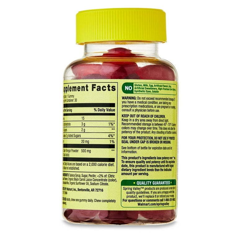 Spring Valley Apple Cider Vinegar Dietary Supplement Vegetarian Gummies are a great supplement to ingest to help with digestive health.* Each gummy contains 500 milligrams of apple cider vinegar powder. These vegetarian gummies contain no gluten, milk, egg, artificial flavors, soy, artificial sweeteners, high fructose corn syrup, synthetic dyes, and gelatin. They are non-GMO project verified, so you can feel good about your choice. The suggested adult dose is chew one gummy daily. Take the necessary steps to help your digestive health with Spring Valley Apple Cider Vinegar Dietary Supplement Vegetarian Gummies.