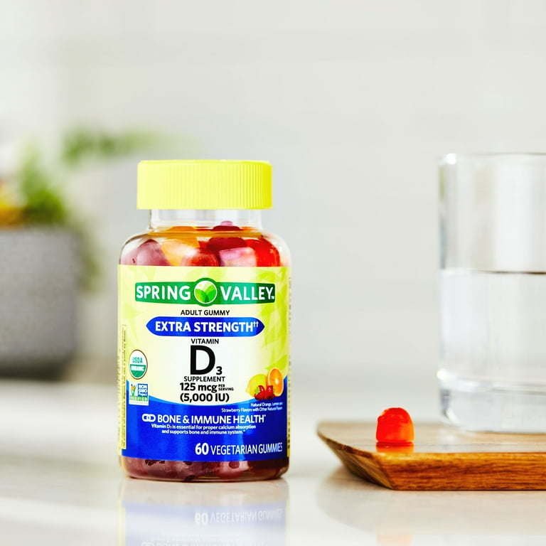Spring Valley Extra Strength Vitamin D3 Bone & Immune Health Dietary Supplement Vegetarian Gummies, 125 mcg (5,000 IU), 60 Count Spring Valley Extra Strength Vitamin D3 Bone & Immune Health Dietary Supplement Vegetarian Gummies, 125 mcg (5,000 IU), 60 Count Spring Valley Extra Strength Vitamin D3 Bone & Immune Health Dietary Supplement Vegetarian Gummies, 125 mcg (5,000 IU), 60 Count