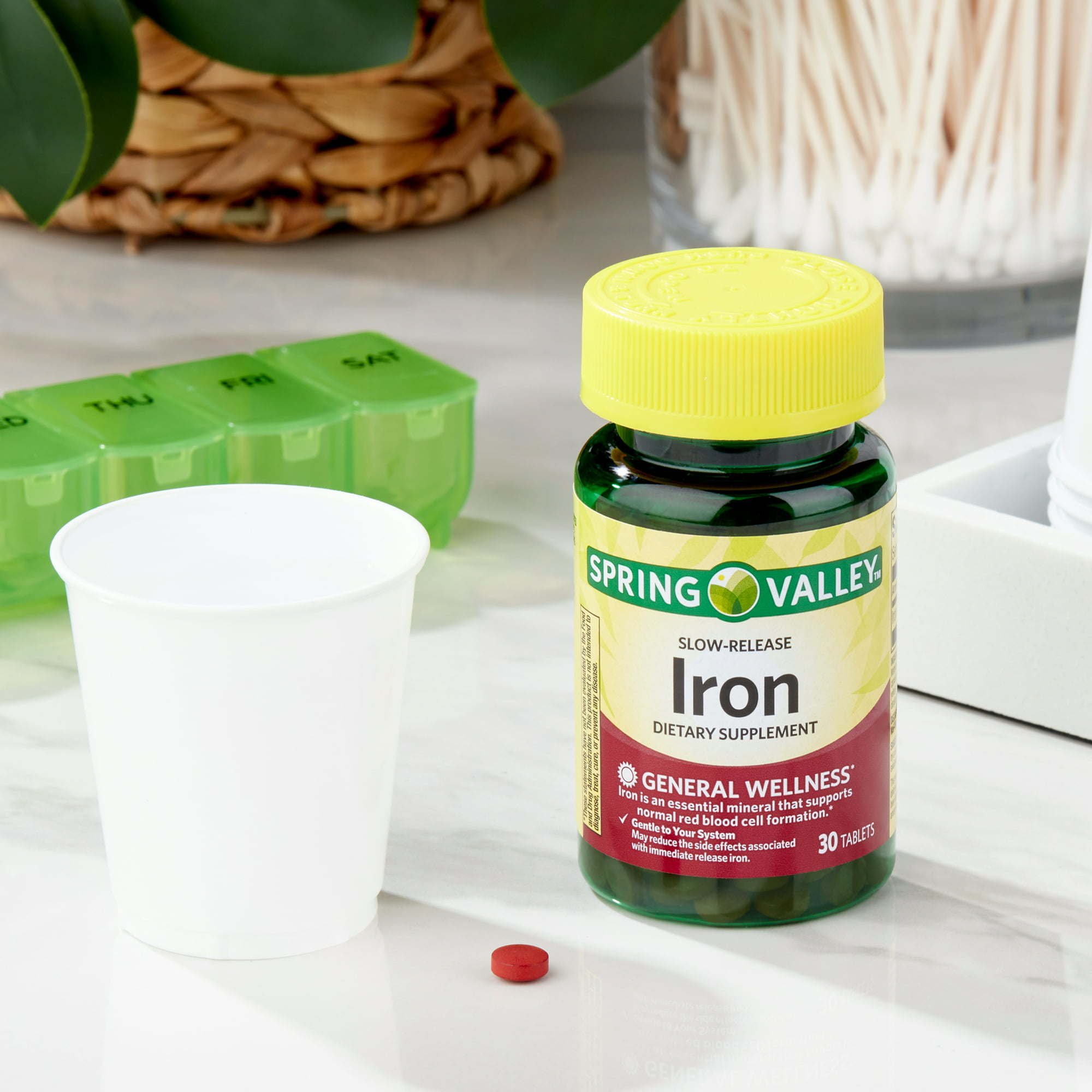 Our Spring Valley Slow-Release Iron Tablets; 45 mg is a dietary supplement for iron deficiency and iron deficiency anemia*; when the need for such supplementation has been determined by a doctor. Iron deficiency is most common among women (approximately 11% of U.S. women). Each tablet delivers 45 mg of elemental iron (144 mg of dried ferrous sulfate). Iron is an essential mineral that supports normal red blood cell formation.* This formula has a timed-release delivery system that gradually releases iron over a period of time; which may reduce gastrointestinal (GI) side effects such as nausea and abdominal discomfort common with iron supplementation. The suggested adult dosage is one tablet daily or as recommended by a doctor. You can rest assured that Spring Valley Slow-Release Iron Tablets Dietary Supplement; 45 mg is produced with strict quality guidelines and is backed by our quality guarantee.