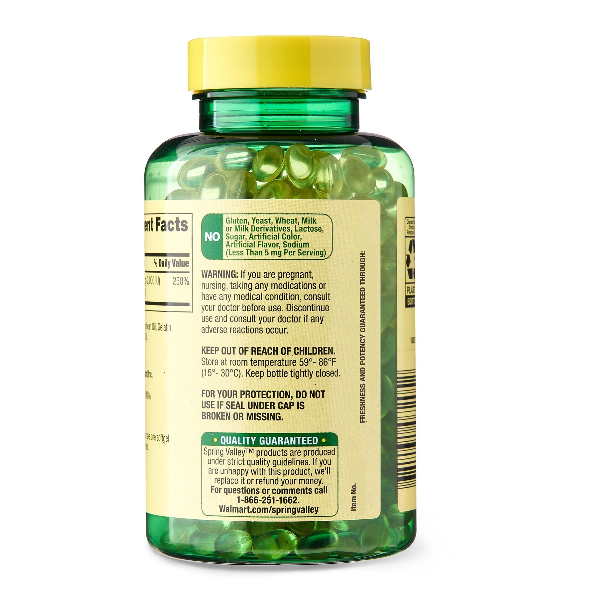 Spring Valley Vitamin D3 Supplement is a supplement designed to support bone and immune health.* Vitamin D3 is essential for proper calcium absorption and supports bone and immune health.* The suggested adult dosage is one softgel per day; preferably with a meal. They contain no gluten; yeast; wheat; milk or milk derivatives; lactose; sugar; artificial colors; or flavors; and they contain less than five milligrams of sodium per serving. You can rest assured that Spring Valley Vitamin D3 Supplement is produced with strict quality guidelines and is backed by our quality guarantee.