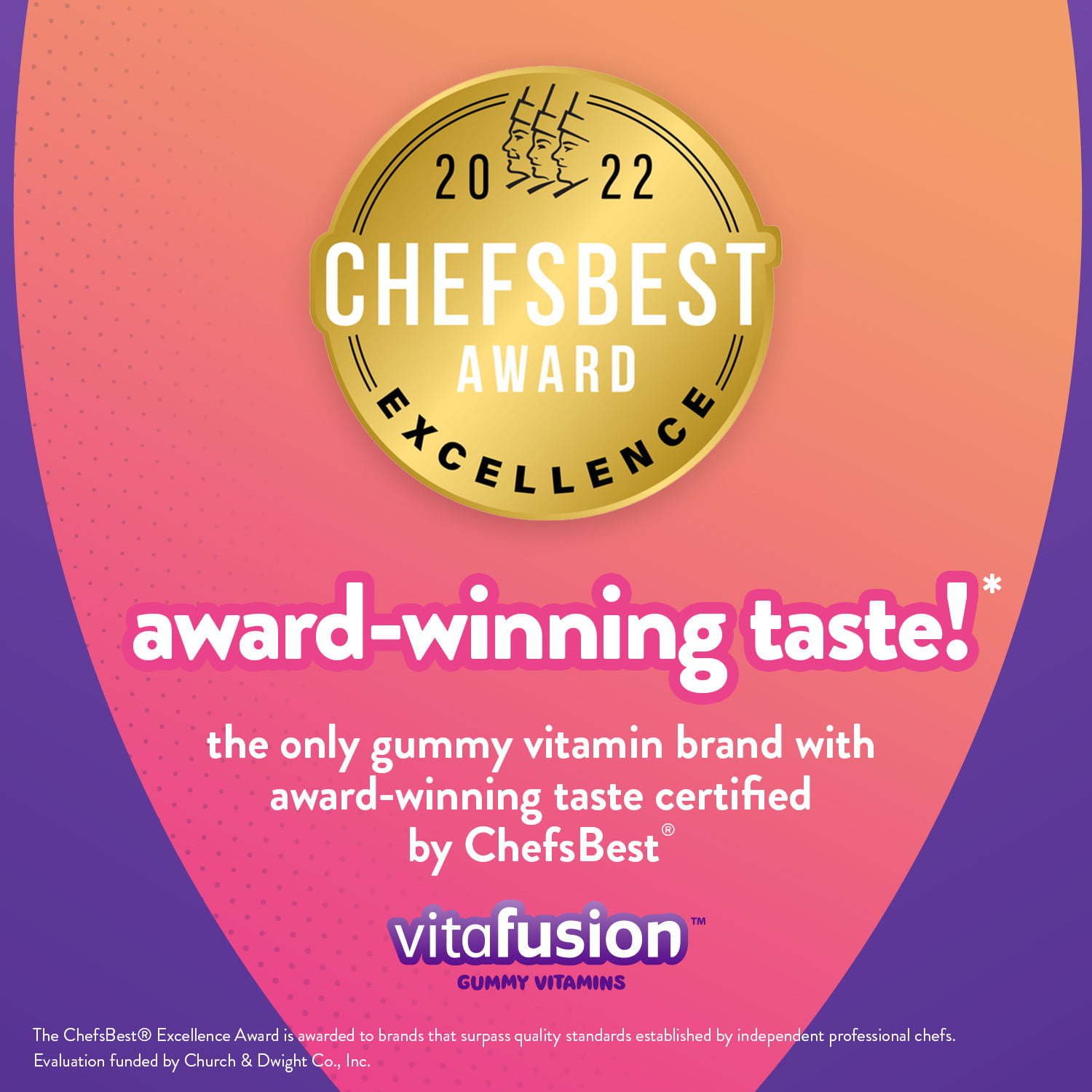 The vitafusion Vitamin B-12 Gummy Supplement fuses nutrition with a delicious; natural raspberry flavor gummy to provide 1000 mcg of Vitamin B-12 complex in each serving. Two gummies provide 1000 mcg – over 41500% daily value – of B-12. At vitafusion; we believe taste and nutrition can be fused together to deliver the best vitamin supplements; ensuring it’s an easy and delicious part of your day. For over 12 years; we’ve been helping people to live happy and healthy lives with our adult gummy vitamins. vitafusion supplements prove that anything is possible when great nutrition is your foundation. Check out our line of Vitamin B-12 gummies and energy supplement gummy products. vitafusion is the only gummy vitamin brand with products that have been awarded the ChefsBest Excellence award for taste; this Vitamin B12 dietary supplement was the recipient of the 2022 ChefsBest Excellence Award (2). Take a fruitful step toward a healthier; happier world with America’s #1 gummy vitamin brand. (1) These statements have not been evaluated by the Food and Drug Administration. This product is not intended to diagnose; treat; cure or prevent any disease. (2) The ChefsBest Excellence Award is awarded to brands that surpass quality standards established by independent professional chefs. Evaluation funded by Church & Dwight Co.; Inc.