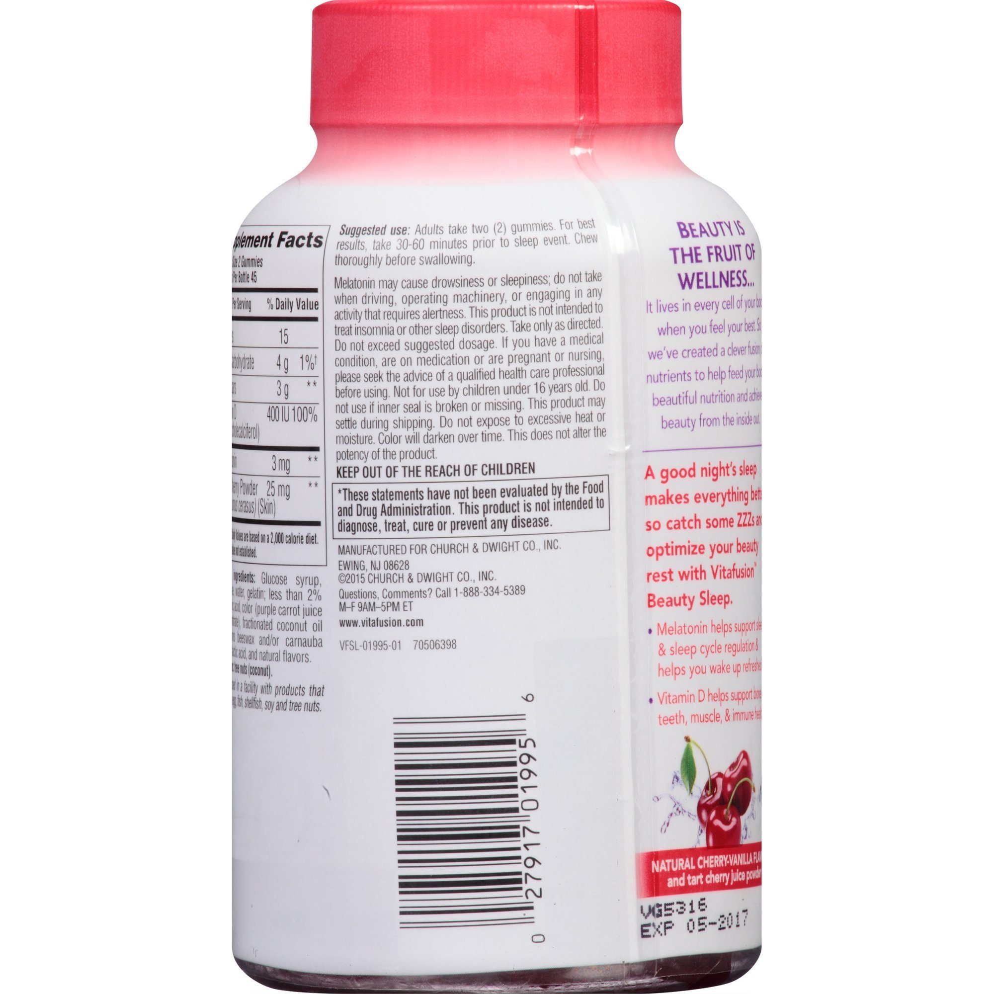 Get the assistance you need to fall asleep faster and get a good night's rest with the vitafusion Beauty Sleep Melatonin Gummy Supplement 90-count bottle. Beauty is the fruit of wellness. It lives in every cell of your body when you feel your best. These gluten-free nutritional supplements contain a clever fusion of nutrients to help feed your body the nutrition it needs to achieve beauty from the inside out. This dietary supplement melatonin dose provides 5 mg per serving to help induce natural sleep; plus Vitamin D for bone health. vitafusion Beauty Sleep Gummies come in a Natural Berry flavor. These melatonin vitamin gummies are easy-to-take sleep vitamins. Look for our melatonin gummies for kids. They have no artificial colors or flavors; no artificial sweetener; no high-fructose corn syrup and are dairy- and gluten-free.